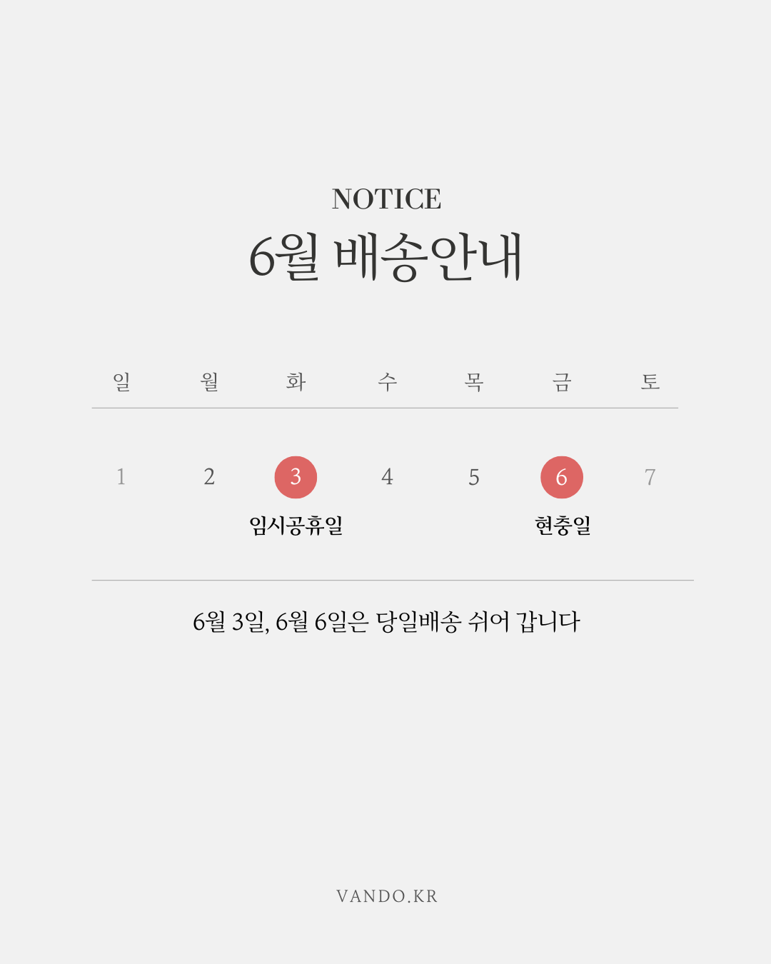 6월 3일(월) 임시공휴일과 6월 6일(목) 현충일에는당일배송이 진행되지 않습니다.